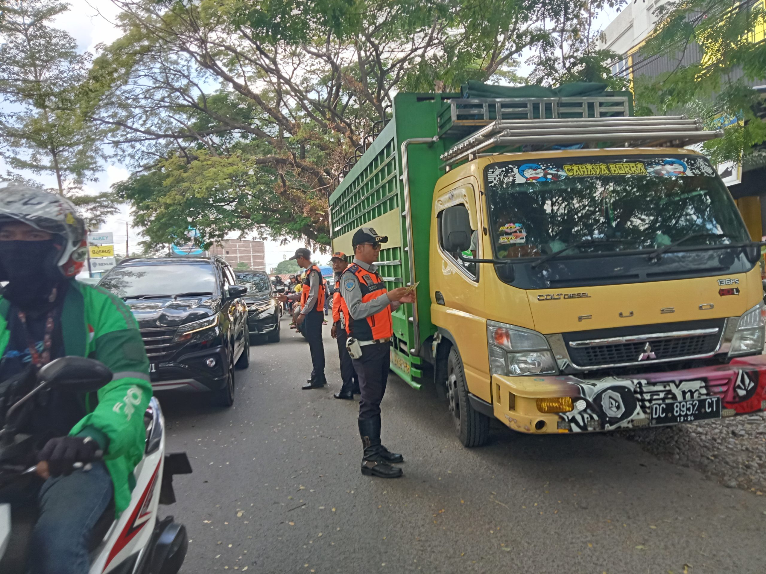 MAKASSAR, TIMESTIMUR — Bidang Pengembangan Keselamatan dan Penindakan Dinas Perhubungan Kota Makassar melakukan Giat Perwali 94 terkait Peraturan kendaraan angkutan barang di Wilayah Kota Makassar, di Batas Kota Gowa pada . (Senin, 24/06/2024)