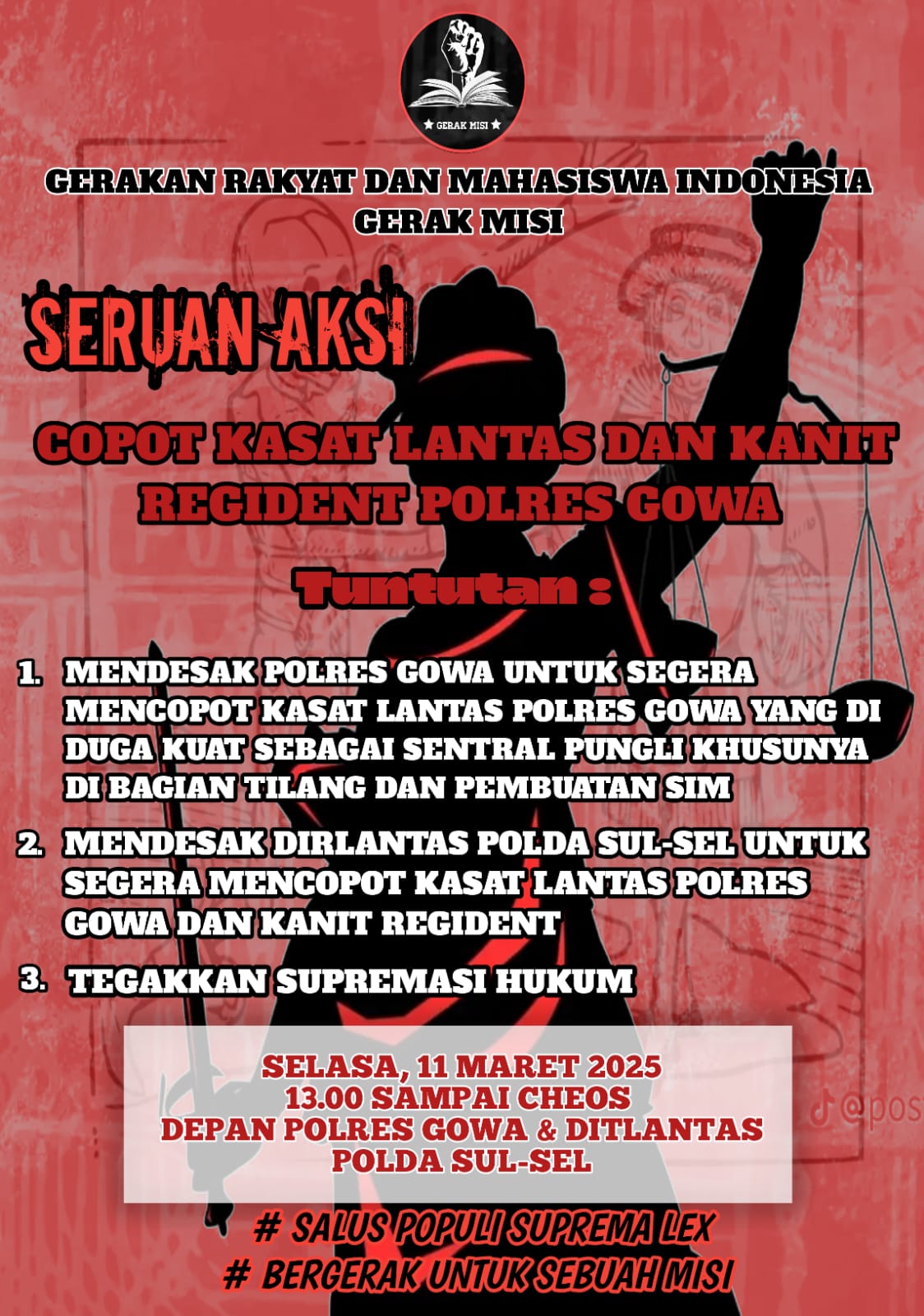 Setelah beberapa menit melakukan orasih didepan kantor Polres Gowa, massa pun melanjutkan orasinya dengan memaparkan dengan hal, agar Kapolres Gowa segera mengganti Kasat lantas serta Kanit Regident Polres Gowa