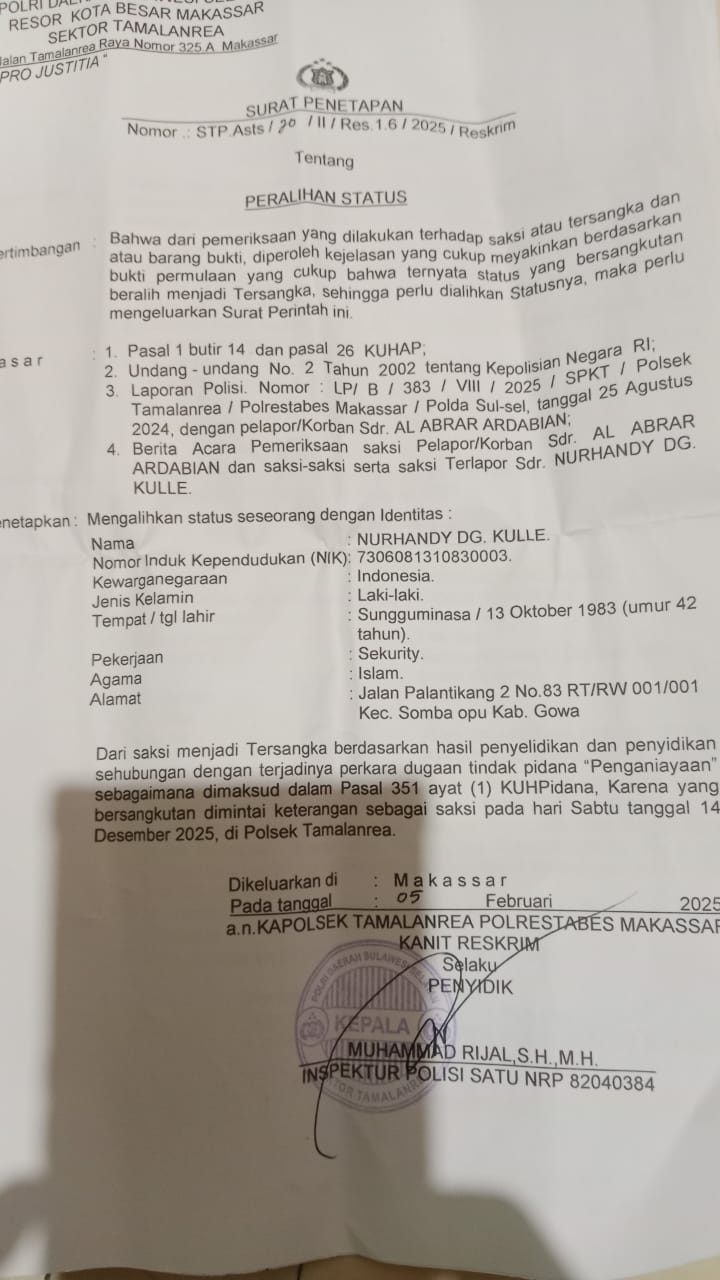 TIMESTIMUR, MAKASSAR — Polemik Kasus yang di sangkakan terhadap Nurhandi Dg Kulle kini menuai pertanyaan besar dari keluarga yang di tersangkakan oleh penyidik Polsek Tamalanrea