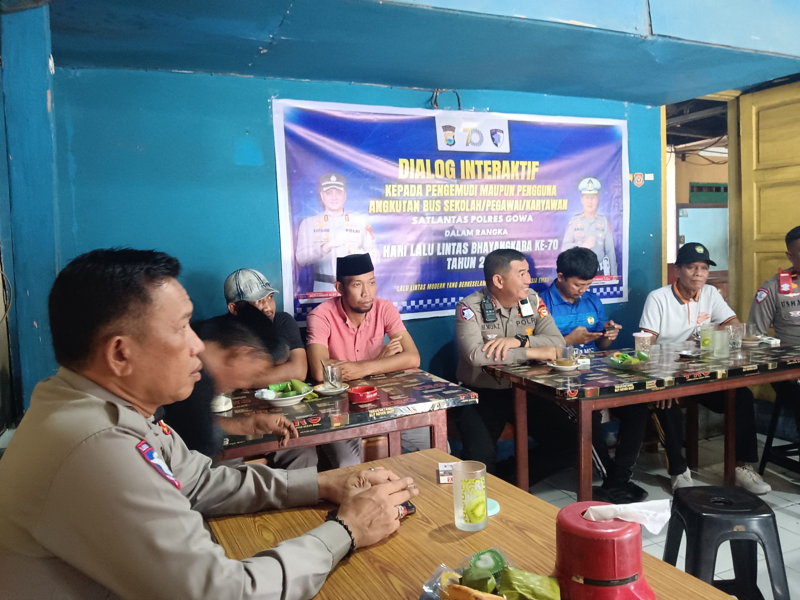 TIMESTIMUR, GOWA — Satuan Lalu Lintas Polres Gowa melalui Satgas Preemtif mengajak para Sopir untuk memberikan Edukasi Interaktif langsung ke lapangan menyapa para sopir angkutan umum sambil ngopi bareng di Warkop, khususnya sopir bus mini yang beroperasi di sekitar Sekolah, Rabu (10/09/2025). Kegiatan bertajuk “Polantas Menyapa yang membawa mobil Bus Sekolah” ini dipimpin Kasat Lantas Polres Gowa, AKP Muh Muaz, S. Sos dan diikuti Para Kanit sertaanggota Satlantas.