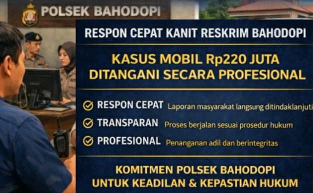 Kanit Reskrim Polsek Bahodopi, IPDA Kamaluddin,SH, mendapat apresiasi atas sikap kooperatif dan terbuka dalam menerima laporan masyarakat. Pelapor, Ichsan, yang mengalami kerugian atas satu unit mobil bernilai sekitar Rp220 juta, mengaku telah mendapatkan pelayanan yang baik selama proses pelaporan berlangsung.